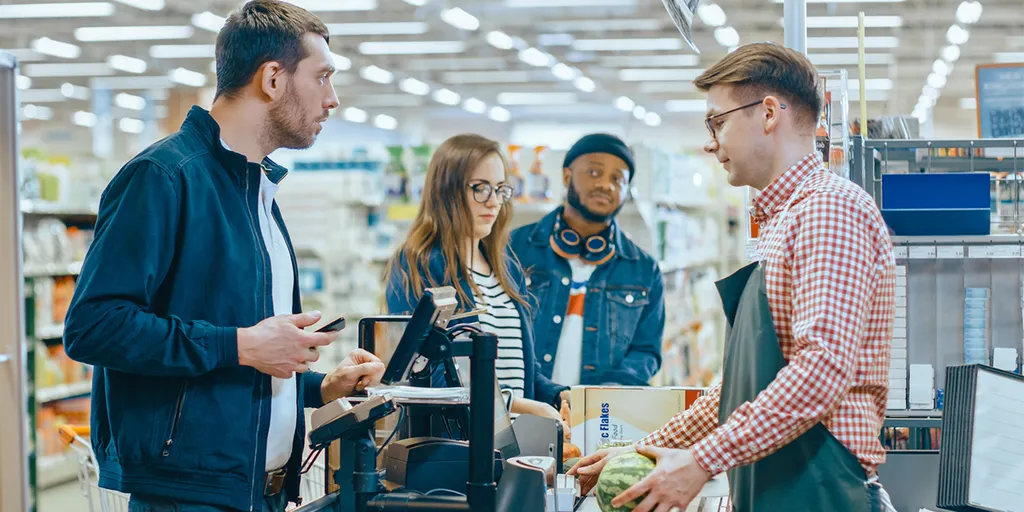 Person At Top Of Shop Queue Taken Completely By Surprise By Request To Pay For Goods